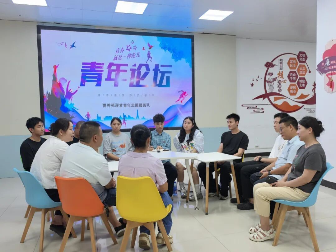 田欢与悦秀苑逐梦青年志愿服务队成员交流座谈。